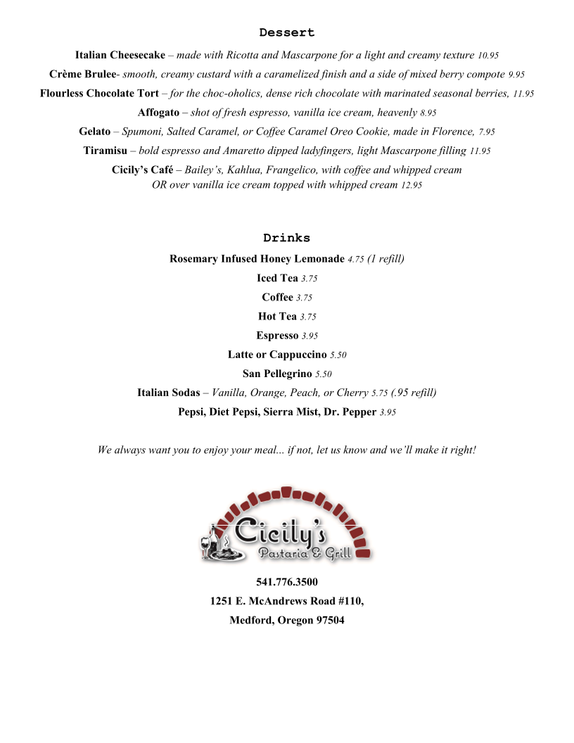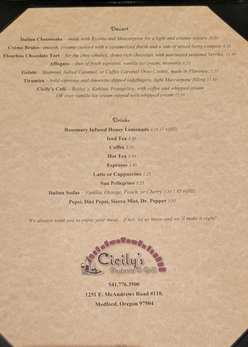 Welcome to Cicily's Pastaria & Grill, a culinary gem located in Medford, OR. This warm and inviting restaurant offers a delightful ambience, perfect for romantic evenings or casual gatherings with friends. Guests rave about the mouthwatering dishes, including their famed risotto fritters, which are often described as "TO DIE FOR." The menu is a testament to exceptional quality, featuring items like tender chicken piccata and flavorful salmon chowder.